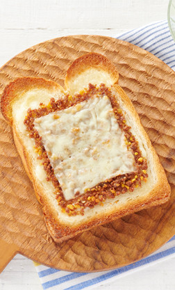 원재료: 식물 유지(일본제조), 대두 가공품, 치즈 파우더, 카레 가루, 치즈 소보로, 우스터 소스, 간장, 쇠고기 추출물 조미료, 닭고기, 식물성 단백, 사과 페이스트, 딸기, 튀김 양파, 달걀 흰 분말,식염, 덱스트린, 닭지방, 엑기스(효모, 닭고기), 물엿, 양파 분말, 후추 / 솔비트, 트레할로스, 셀룰로오스, 조미료 (아미노산 등),가공 전분, 착색료(캐러멜, 홍국, 카로티노이드), 유화제, 팽창제, 산화 방지제 (비타민 E, 로즈마리 추출물), 향료, 산미료,(일부는 계란, 우유 성분, 밀, 쇠고기, 참깨, 콩, 닭고기, 사과 포함)
