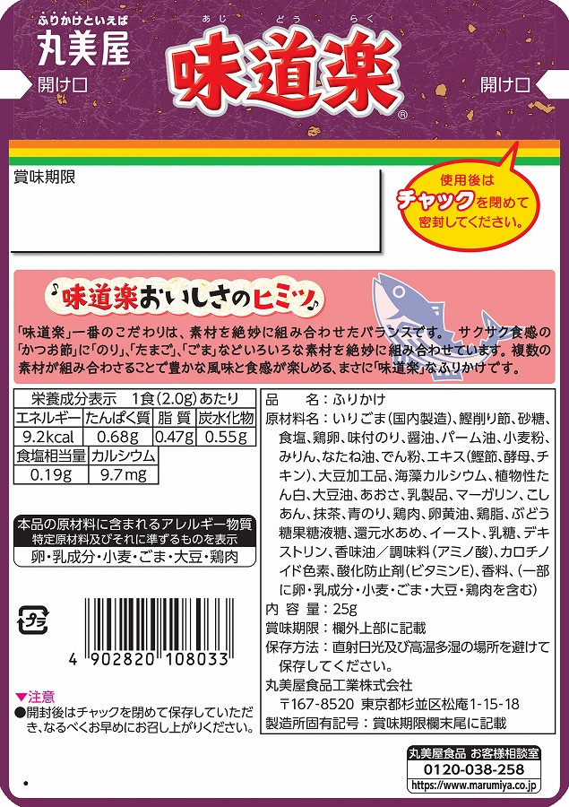 원재료: [노리타마]볶은 깨(일본제조), 닭 달걀 가공품, 유당, 설탕, 밀가루, 식염, 김, 콩 가공품, 가공 유지, 팥소, 고등어 가다랑어 포, 된장, 유제품, 추출물 (닭고기, 해산물, 다시마, 가다랭이, 효모) , 해조류 칼슘, 야자 기름, 닭고기 분말, 전분, 간장, 식물성 단백, 닭고기, 파래, 액상포도당, 말차, 미림, 효모, 덱스트린, 설탕 시럽/조미료(아미노산), 카로티노이드 색소, 산화 방지제 (비타민 E), 향료, (일부에 계란, 우유 성분, 밀, 참깨, 고등어, 콩, 닭고기를 포함)[아지도라쿠]참깨(일본제조), 가다랭이, 설탕, 식염, 계란, 양념, 간장, 야자기름, 밀가루, 미림, 유채기름, 전분, 추출물 (가다랭이, 효모, 닭고기), 대두 가공품, 해초 칼슘, 식물 성단백, 대두유, 파래, 유제품, 마가린, 팥소, 말차, 김, 닭고기, 버터, 닭고기,액상포도당, 물엿, 효모, 유당, 덱스트린, 향미유/조미료(아미노산), 카로티노이드색소, 산화방지제(비타민E), 향료, (일부에 계란·유성분·밀·참깨·대두·닭고기 포함) [스키야키]밀가루(일본제조), 설탕, 볶은 깨, 간장, 쇠고기, 식염, 닭 달걀 가공품, 팥소, 라드, 유당, 전분, 식물성 단백, 야자기름, 마가린, 해초 칼슘, 양파 분말, 유제품, 향유, 대두 가공품, 엑기스(효모, 쇠고기, 달고기), 액상포도당, 미림, 덱스트린, 효모, 양념 김, 스키야키 풍미 시즈닝, 된장, 향신료, 닭고기 분말, 닭고기, 포도당, 물엿/조미 재료 (아미노산 등), 착색료 (적색 비트, 카라멜, 홍국, 카로티노이드), 셀룰로오스, 팽창제, 향료, 산화 방지제 (비타민 E, 로즈마리 추출물), 향신료 추출물, (일부에 계란 · 우유 성분, 밀, 쇠고기, 참깨, 콩, 닭고기를 포함)[타라코]명란 (미국산, 아이슬란드산), 빵가루, 유당, 식염, 참깨, 대두 가공품, 설탕, 쇼트닝, 김, 고등어, 야자기름, 해산물 추출물 (해산물), 크릴 추출물, 전분, 닭 계란, 간장 , 덱스트린, 해초 칼슘, 설탕실럽, 효모 추출물, 물집, 액상 포도당, 미림, 가다랭이 추출물/조미료(아미노산 등), 착색료(홍국, 카로티노이드), 팽창제, 산화 방지제(비타민 E, 로즈마리 추출물), 향료, (일부는 계란, 우유 성분, 밀, 참깨, 고등어, 콩, 해산물 추출물 (어패류) 포함)[사케아오사]참깨, 유당, 식염, 설탕, 식물성 단백, 연어, 가공 유지, 파래, 가다랭이, 밀가루, 대두 가공품, 김, 해초 칼슘, 유제품, 간장, 말차, 미림 , 전분, 추출물 (가다랑어, 효모), 액상포도당, 효모, 물엿, 덱스트린 / 조미료 (아미노산 등), 착색료 (카로티노이드, 홍 누룩), 산화 방지제 (비타민 E), 향료, (일부에 우유 성분, 밀, 참깨, 버섯, 콩 포함)[코우미시소] 유당(미국제조), 자소, 식염, 사과, 설탕, 김, 참깨, 가다랭이, 밀가루, 물엿, 포도당, 매실초, 간장, 덱스트린, 가공유지, 올리고당, 매실, 해조류 칼슘, 추출물(효모, 가다랭이), 미림, 유제품, 포도당과당액당, 효모/조미료(아미노산 등), 산미료, 착색료(적색 비트, 안토시아닌, 카로티노이드), 향료, 산화 방지제(비타민 E ), 증점제 (크산탄), (일부는 우유 성분, 밀, 참깨, 콩 포함)